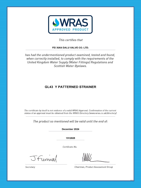 All types of Y Patterned Strainer from DN15 to DN500 produced by us are WRAS approved.